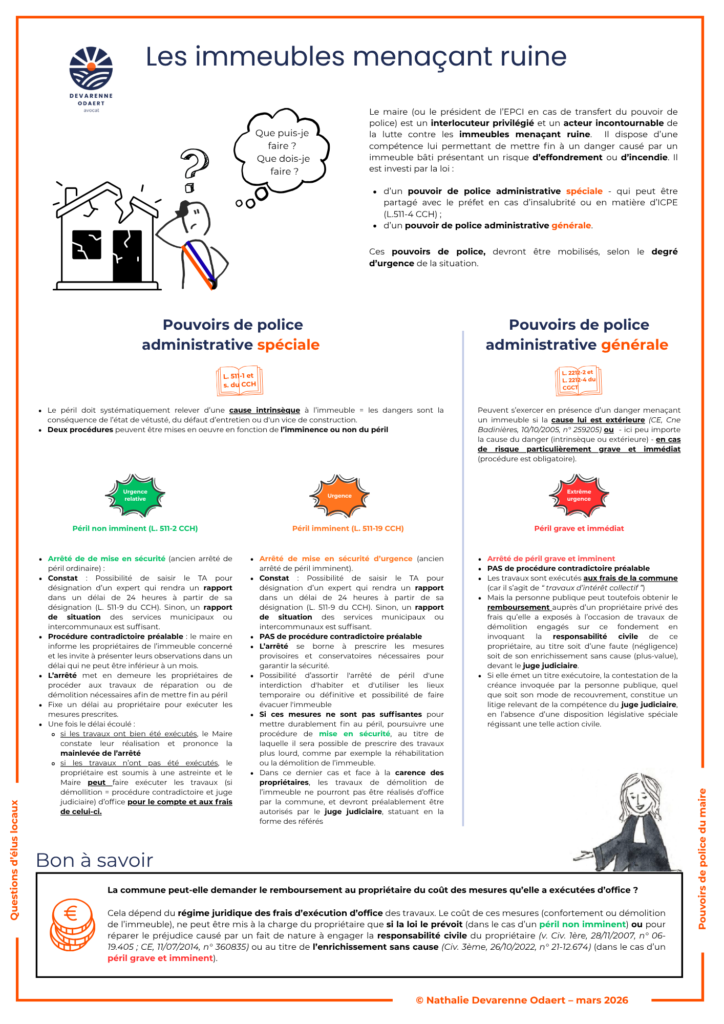📌 Le maire (ou le président de l’EPCI en cas de transfert du pouvoir de police) est un interlocuteur privilégié et un acteur incontournable de la lutte contre les immeubles menaçant ruine. Il dispose d’une compétence lui permettant de mettre fin à un danger causé par un immeuble bâti présentant un risque d’effondrement ou d’incendie. Il est investi par la loi :