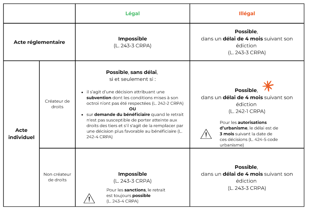 Pour les actes créateurs de droits, l’administration doit déterminer si les conditions d’illégalité d’après la jurisprudence Danthony (CE, Ass., 23 décembre 2011, M. et autres, n°335033, publié au recueil Lebon) sont respectées. Si le vice en cause n’a pas été susceptible d’exercer une influence sur le sens de la décision et n’a privé l’intéressé d’une garantie, la décision ne peut être tenue pour illégale. Le retrait est impossible, même dans le délai de quatre mois (CE, 7 février 2020, n°428625, mentionné aux tables).
